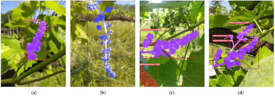 Detection and segmentation of grapevine inflorescence test set samples: (a) correct detection (YOLOv5n), (b) missed detection (YOLOv5s), (c) detections of non-annotated inflorescences (YOLOv8n) and (d) multiple detections of the same inflorescence (YOLOv8s). Red bounding boxes represent the models’ predictions and blue bounding boxes represent the groundtruth annotations.