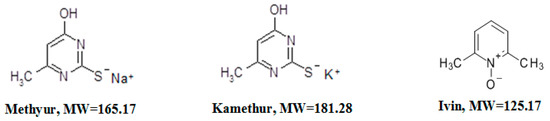 The chemical structure and relative molecular weight of new plant growth regulators Methyur and Kamethur (derivatives of sodium and potassium salts of 6-methyl-2-mercapto-4-hydroxypyrimidine) and Ivin (N-oxide-2,6-dimethylpyridine) are shown in Figure 1.