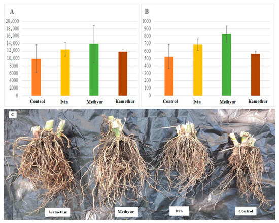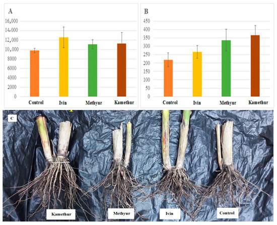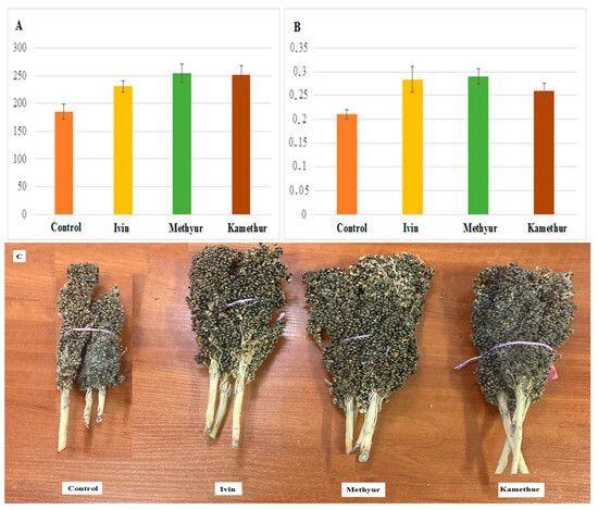 Growth indicators of experimental sweet sorghum (Sorghum saccharatum (L.) Moench) cv. Favorite exceeded that of control plants (Figure 3A–C). Root length (in mm) increased by 20%—in plants treated with Kamethur, 40%—in plants treated with Methyur, and 25%—in plants treated with Ivin, compared to the control. Plant fresh weight (in gram) increased by 7%—in plants treated with Kamethur, 57%—in plants treated with Methyur, and 30%—in plants treated with Ivin, compared to the control.