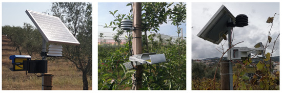 Additionally, a servo motor was also placed in the front with an attached brush that remains above the camera lens while the trap is in the standby position, preventing the entry of dust, insects, water and fertilizers. The camera used was the Raspberry Pi module v2, which offers an 8 MP resolution, which is important to acquire small insects and make their identification possible. The 3D trap model helped to improve our concept and was necessary to generate the print models. The entire trap has a built-in house and uses the polymer PETG since it offers thermal and mechanical resistance. Some prototypes have already been installed in vineyards, orchards and olive groves, as can be seen in Figure 2. All of them are connected to a weather station, which acquires the temperature and humidity of the air, as well as the spectrum of radiation that is affecting the crop.