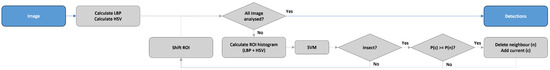 Figure 3 shows the flowchart with the main tasks of the proposed algorithm capable of detecting insects in the input image, with detections as the output. The algorithm initiates the process by computing the image’s LBP and HSV representations. Subsequently, the algorithm systematically scans the image using a predefined number of windows and step size. Within each ROI identified by the sliding windows, if the SVM classifies the region as an insect, it is necessary to check the neighborhood. If the probability of the current region is greater than the neighborhood, then the neighborhood detections are eliminated and the current detection takes precedence. This verification avoids several bounding boxes detecting the same insect. Only the set of new detections is sent to the cloud server, thus allowing us to reduce the bandwidth used.