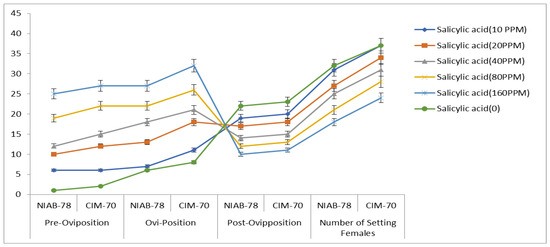 However, when examining the impact of salicylic acid between cotton varieties, it was recorded that in NIAB-78, the pre-oviposition and oviposition times increased less in comparison to CIM-70. Additionally, in the case of post-oviposition time and number of setting females, salicylic acid in NIAB-78 also proved to be the most effective and caused a maximum decrease in post-oviposition time and number of setting females. It was found that one of the two cotton varieties, CIM-70, had the longest pre-oviposition and oviposition times.