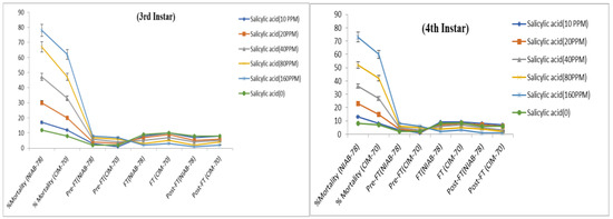 Overall, among both cotton varieties, the application of salicylic acid in NIAB-78 exhibited significant results and caused the maximum percent mortality of pink bollworms, and pink bollworms also spent the maximum time to start feeding. The feeding time and post-feeding time were also recorded to be minimum in NIAB-78 in comparison to the control. Almost the same trend was followed during the fourth instar of pink bollworms.