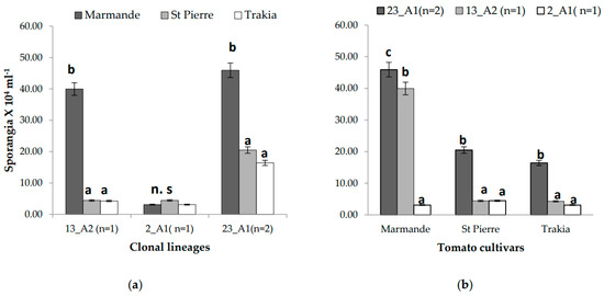 The rate of sporulation production expressed as the number of sporangia × 104 mL−1: (a) Comparison between tomato cultivars; (b) comparison of P. infestans clonal lineages. Letters a–c: classification of means into homogeneous groups.