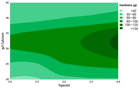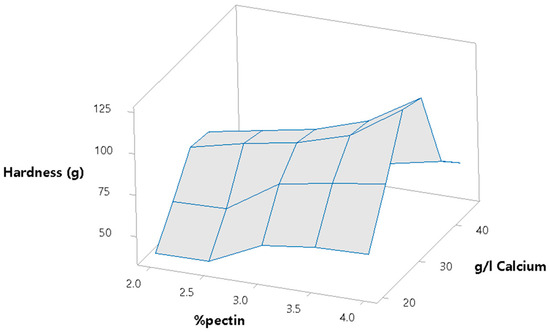 The responses obtained coincide with what was anticipated in the literature. There was a region where the maximum hardness was obtained that corresponds to the interval of 30–35 mg/L of calcium. Naturally, as the pectin concentration increased, the calcium concentration was kept constant, and the hardness of the gel increased. The optimal formulation depends directly on the final use of the gel in the industry.