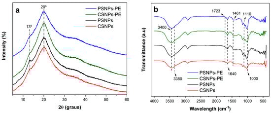 (a) X-ray diffractograms and (b) FTIR spectra of starch nanoparticles with (PSNPs-PE and CSNPs-PE) and without (PSNPs and CSNPs) PE.