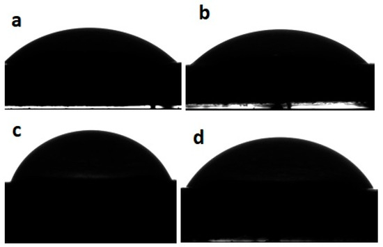 The WCA of potato (a) and cassava (b) starch nanoparticles and potato (c) and cassava (d) starch nanoparticles loaded with the phenolic compounds from green PE.