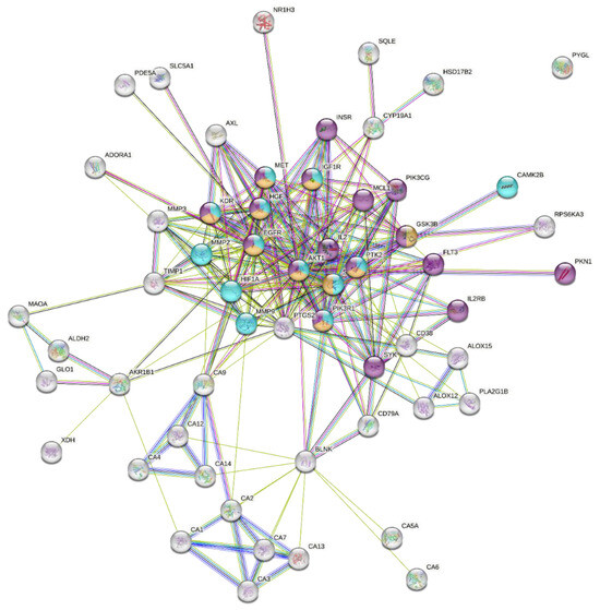 - Szklarczyk, D.; Gable, A.L.; Nastou, K.C.; Lyon, D.; Kirsch, R.; Pyysalo, S.; Doncheva, N.T.; Legeay, M.; Fang, T.; Bork, P.; et al. The STRING database in 2021: Customizable protein–protein networks, and functional characterization of user-uploaded gene/measurement sets. Nucleic Acids Res. 2021, 49, D605–D612. [Google Scholar] [CrossRef]