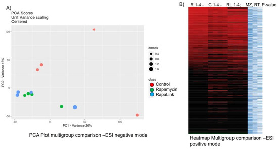Principal component analysis (PCA) and heatmap visualization tools to compare the treatment groups. Pancreatic beta cell lines (β-TC-6) were incubated with either RapaLink, Rapamycin, or control for 24 h. Cells were harvested, flush-frozen, extracted and analyzed using an ESI-LC-MS/MS spectrometry-based approach. The data were collected and analyzed using the XCMS-Plus bioinformatics platform. (A) Principal component analysis (PCA) clusters of the treatment groups. (B). Heatmap visualization of the comparison of the untargeted metabolomics data.