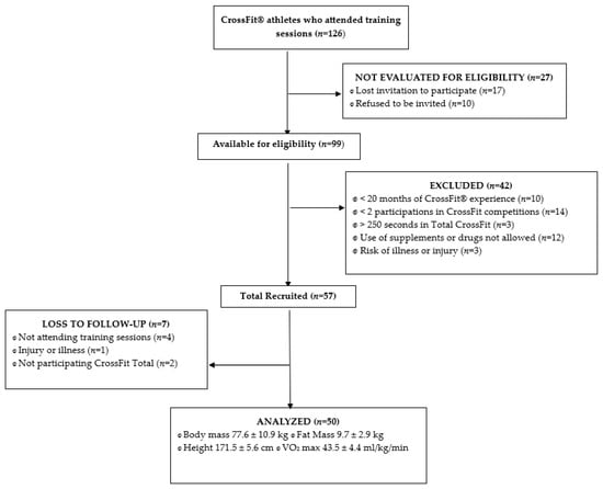 A multicenter epidemiological, observational, longitudinal, pilot study was conducted in 2 CrossFit® Boxes and we report it here according to the Strengthening the Reporting of Observational Studies in Epidemiology (STROBE) statement []. This study’s participants were highly trained CrossFit® athletes (n = 126) training in CrossFit® Boxes in Spain (Figure 1). This study was approved by the Clinical Research Ethics Committee (CREC) of Valladolid Clinical Hospital (PI-19-1350) (Spain). Following the Declaration of Helsinki and the 2013 Fortaleza Revision [], the informed consent document was drafted that all CrossFit® practitioners read, accepted and signed.