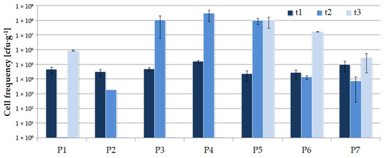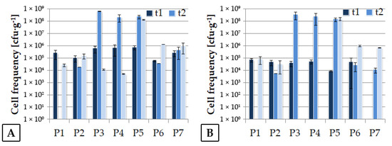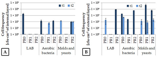 A relatively low frequency of strains was detected on the film’s internal surface (Figure 5A). For the external film layer colonization, greater variability in the microbial frequency was observed (Figure 5B), possibly resulting from more changeable weather conditions.
