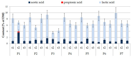 The concentration of lactic acid in the tested samples varied between 2.1–9.3% of DM (Figure 3). It is notable that a very important parameter of silage quality is the lactic-to-acetic acid ratio, and lactic acid should contribute more than 70% [1,6]. The results of the present study show that only for 2 cases, variants P1 and P3, after 11 months of storage, the abovementioned ratio was lower than 72%. A decrease in total acids content over time was observed for most combinations, which may be an indicator of yeast and acetic acid bacteria activities in silage [2,10].