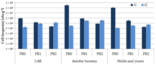 The number of LAB in the silage (Figure 4) was moderate, ranging between 104 and 106 cfu·g−1 DM, and did not change significantly during storage for the tested samples PR1 and PR2. Except for PR0 after 4 months of storage, for all the tested silages, the number of molds and yeasts was kept below 106 cfu·g−1, which suggests that the material was well preserved and anaerobic conditions were maintained properly [2].