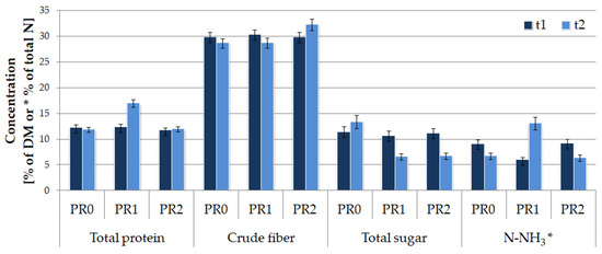 No significant differences in crude fiber content were observed between samples (Figure 6). In turn, a decrease in sugar content in samples PR1 and PR2 may indicate active microbial metabolism. A high level of ammonia nitrogen and the elevation of total protein content was observed in sample PR1 after 10 months of storage. This change is possibly linked to the degradation of plant tissues [5,6,10] and may additionally result from the disruption of the covering film structure.