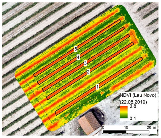 Flight planning and execution was performed to obtain images with a high resolution RGB (20 Mp) and Parrot Sequoia Plus installed multispectral cameras in an unmanned aerial vehicle (UAV), model DJI Phantom 4 Pro +. The multispectral camera had four band sensors: Green (550 BP 40), Red (660 BP 40), Red Edge (735 BP 10) and Near Infrared (790 BP 40). After acquisition of images, an orthophotomap was processed and, using the altimetry data, the digital model of the terrain (MDT) was obtained, as well as the surface drainage model (using the ARCGIS and Agisoft Photoscan software), creating the vegetation index maps that reflect the vigor of the plants (NDVI) [11].