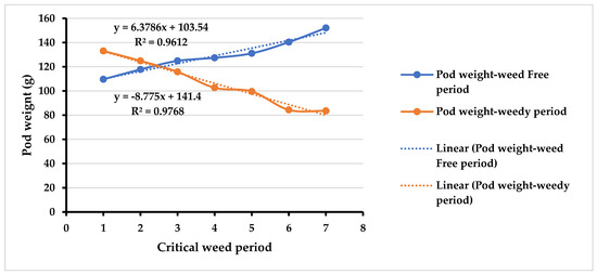 The highest value of pod weight in weed free condition was when the field was free from weeds from the planting to harvest (control 1—weed free for the whole season) because there was no competition between green gram and weeds. Having weeds the whole season (control 2) resulted in the lowest pod weight because there was competition between green gram and weeds. When increasing the weedy period or weed free period, pod yield declined or increased, respectively (