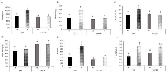 - Francesca, S.; Arena, C.; Hay Mele, B.; Schettini, C.; Ambrosino, P.; Barone, A.; Rigano, M.M. The use of a plant-based biostimulant improves plant performances and fruit quality in tomato plants grown at elevated temperatures. Agronomy 2020, 10, 363. [Google Scholar] [CrossRef] [Green Version]