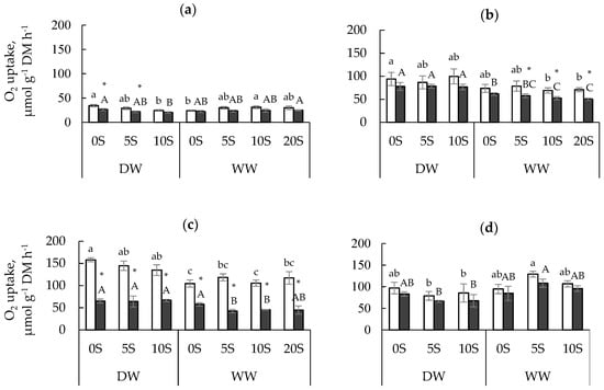 Total respiration (white bars) and SHAM-resistant respiration (black bars) for onion leaves (a–c) and roots (d) grown on the Umbric Podzols with shungite concentrations of 0 (0S), 5 (5S), 10 (10S), and 20 (20S) g kg−1 under drying–wetting (DW) or well-watered (WW) regimes. During the measurements, the temperature was kept at 13 (a), 23 (b), or 33 (c) °C. Different letters indicate significant differences: lower case isused for the white bars, capitals are used for the black bars. * Indicates significant differences between Vt and VSHAM-res at p < 0.05.