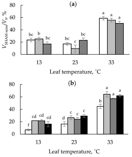 In contrast to the roots, for the leaves, the two-way ANOVA revealed a significant effect of both shungite application and soil water availability and their interaction on the VSHAM-sen/Vt ratio (Table 1). In contrast to the DW cycle, shungite application significantly increased the leaf VSHAM-sen/Vt values for the seedlings grown under the WW regime at all measurement temperatures, regardless of the soil shungite content (Figure 2).