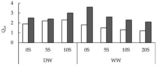 Temperature sensitivity (Q10) of the SHAM-resistant (white bars) and SHAM-sensitive (black bars) leaf respiration of onion seedlings growing on the Umbric Podzols, with shungite concentrations of 0 (0S), 5 (5S), 10 (10S), and 20 (20S) g kg−1 under drying–wetting (DW) or well-watered (WW) regimes.