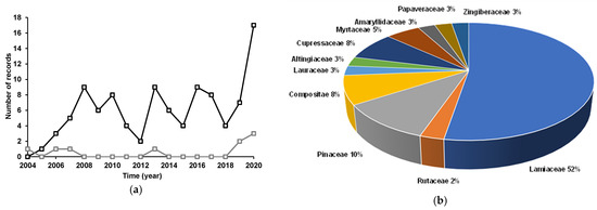 ) (a). Percentage of essential oils tested against the pine processionary, distributed by family of plant source (b).