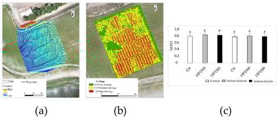 Orthophotomaps of: (a) water lines, slope/surface drainage; (b) Information collected at 18 June 2019 and mean values of normalized vegetation index (NDVI) ± standard deviation; (c) Information collected at 25 June 2019. Obtained from images obtained with UAVs (n = 12), from O. sativa OP1505 and OP1509 submitted to foliar fertilization with sodium selenate and sodium selenite. a reveals the absence of significant differences among treatments of each genotype.