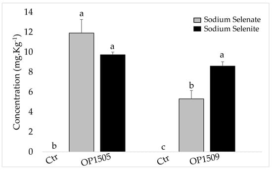 Foliar fertilization with both forms promoted the accumulation of Se in the whole flour compared to the control (Figure 2). Genotype OP1505 showed a higher value in selenate treatment (11.9 mg kg−1), while OP1509 revealed significant differences in both treatments, particularly in the selenite treatment (8.60 mg kg−1), relative to the control.