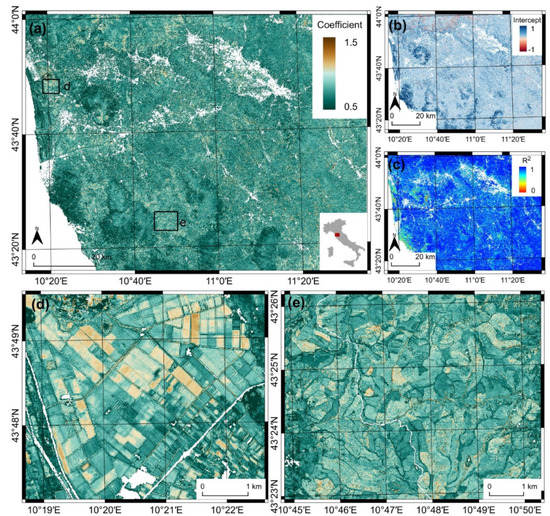 Spatially explicit linear regression results: (a) linear regression coefficient; (b) linear regression intercept; (c) coefficient of determination; (d) spatial detail of linear regression coefficient over plain croplands; and (e) spatial detail of linear regression coefficient over hilly croplands.