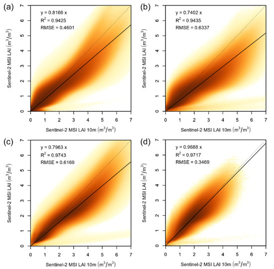 Density scatterplot showing the linear relationship for LAI estimated using the two Sentinel-2 MSI models calibrated on different band sets for main land cover classes: (a) croplands; (b) grasslands; (c) broadleaved forests; and (d) needleleaved forests.