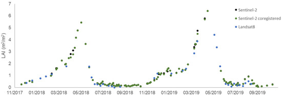 The plot in Figure 5 shows how LAI estimates from multiple satellite sensors, with an unbiased linear relationship, can constitute denser time series from virtual satellite constellation, contributing to improve temporal analysis, such as vegetation phenology estimation, and consequently enhancing agroecosystems monitoring capacity. The weak spatial coherence of Sentinel-2 acquisitions over time requires an image co-registration procedure to be applied in order to reduce shaky time series [12].