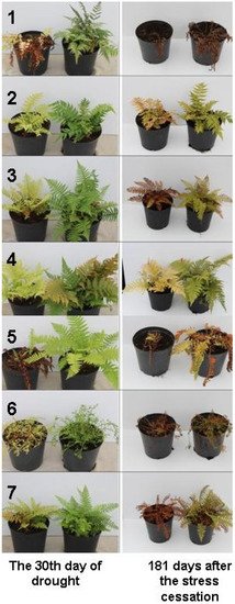 13]. This makes studies on the sensitivity of different hardy garden fern genotypes to abiotic stress highly justified, as they should allow for pinpointing the most tolerant species and cultivars. The aim of this study was to compare the growth and decorative value of seven taxa of ground ferns cultivated under optimal conditions and under drought stress. We also determined the long-term effect of drought on plant quality by assessing their condition after winter.