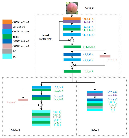 The trunk network is responsible for extracting common feature information required by both the M-Net and D-Net. Therefore, the design of this component directly affects the prediction results of the two sub-tasks and the accuracy of fruit quality classification. During the training process, as the depth of the neural network increases, there is a risk of degradation in model performance [14]. To address this issue, an improved backbone network based on the principles of residual networks is adopted. In this section, a five-layer CNN model is used as the backbone network to extract feature information. The design of the backbone network utilizes a skip connection structure to mitigate problems such as gradient explosion or over-fitting. By sharing features, the extracted feature information is simultaneously provided to both the defect classification task and the maturity classification task.