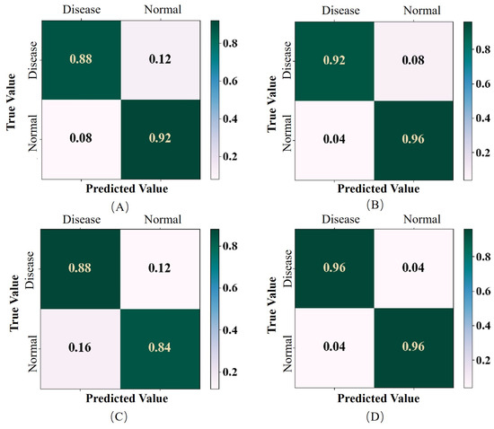 Confusion matrix results for bi-classification of disease from D-Net. In particular, (A), (B), (C) and (D) are the results of Alexnet, Resnet, VGG-16 and D-net, respectively.