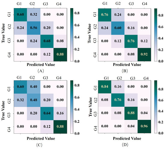 According to the results, compared to AlexNet, ResNet-18, ResNet-34, and VGG-16, the M-Net model shows a significant improvement in average accuracy. Furthermore, M-Net outperforms AlexNet, ResNet-18, ResNet-34, and VGG-16 by evaluating the model’s performance in terms of recall, precision, and F1-score for each maturity grade. Specifically, as for G1, M-Net improves the F1-score by 16%, 11%, 12%, and 24% respectively. As for G2, the improvements are 23%, 15%, 13%, and 30% respectively. For G3, the improvements are 17%, 9%, 13%, and 20% respectively. And for G4, the improvements are 6%, 6%, 6%, and 10% respectively. These results indicate that M-Net achieves significant improvements in classifying different maturity grades. The distribution of values in the confusion matrix for each maturity grade is shown in Figure 3.