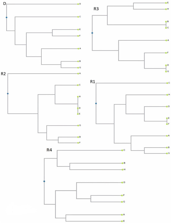 The Cophenetic correlation coefficient when using primer R1 is 0.83; for R2, it is 0.91; for R3, it is 0.94; for R4, it is 0.79; and for D, it is 0.86. The genetic distance was from 0.000 (Odmiana and Lane Late) to 0.545 (Odmiana and Navel Late, Lane Late, and Navel Late) by using primer R1, from 0.000 (Odmiana and Mid Knights, Valencia and Mid Knights, Valencia, and Odmiana) to 0.556 (Navel and Salustiana) by using primer R2, from 0.000 (Navel and Mid Knights, Navelina, and Navel Late) to 0.667 (Salustiana and Valencia, Mid Knights, and Valencia) by using primer R3, from 0.222 (Navel and Lane Late) to 0.636 (Navel and Valencia) by using primer R4, and from 0.167 (Navel and Navelina) to 0.889 (Mid Knights and Navel Late) by using primer D. From the results of the distance matrix and dendrograms (Figure 1), we can conclude that when we use primer R1 and R2, the same profile was degenerated between some varieties, but on the contrary, by using primers R3, R4, and D, there were different profiles between each variety.
