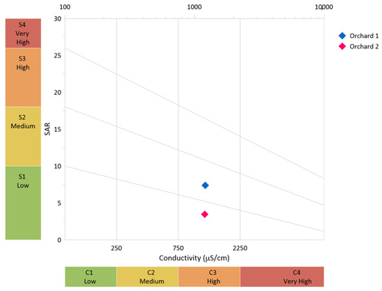 The projection of the hydrochemical facies in a Piper’s triangular diagram (Figure 1), reveals that orchard 1 presents higher values of Na+, K+, SO42−, and HCO3− and inferior values of Ca2+, Mg2+, and Cl− than orchard 2. Water classification for agricultural use (Figure 2) presents similar values of EC, while the SAR index is superior in orchard 1.
