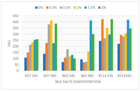 To determine bile salt tolerance, Gilliland et al.’s approach [] was modified in certain ways. Nutrient broth (NB) containing 0%, 0.3%, 0.5%, 1%, 1.5% and 2% of bile salts was inoculated with each probiotic strain and incubated for 24 and 48 h at 37 °C. Growth in the control (no bile salts) and test cultures was evaluated at 24 and 48 h by measuring the turbidity (FAU).
