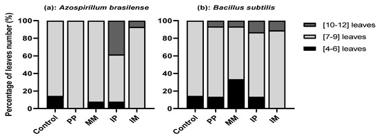 It was observed that A. brasilense and B. subtilis accelerated leaf emergence by increasing leaf number (Figure 1). Both strains generated plants with a number of leaves between ten to twelve leaves. This class of plants did not appear in non-inoculated plants (Control). In plants inoculated with A. brasilense under the (IP) method, we observed that 38.46% of plants had ten to twelve leaves. In addition, when the same strain was inoculated by pellet (PP), 100% of the plants had between seven and nine leaves, and there was an absence of plants having four to six leaves (Figure 1). However, inoculation with B. subtilis showed that all inoculation methods generated plants with ten to twelve leaves, whereas this class was not present in the control. Comparing the two bacteria, we noted that inoculation with the (IM) method for both strains gave two types of plant class: (i) plants that reached the stage of seven to nine leaves and (ii) plants that reached the stage of ten to twelve leaves, with the absence of the four to six leaves class (Figure 1).