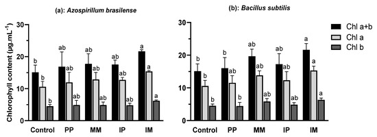 The plants inoculated with the (IM) method in the presence of A. basilense or B. subtilis showed a significant increase in the levels of chlorophyll a and b as compared to the control (Figure 2). PGPR has been shown to also have a positive effect on plant chlorophyll levels, especially under stress conditions [15]. However, chlorophyll a showed the highest increase compared to chlorophyll b. For total chlorophyll, the same result was observed (Figure 2).