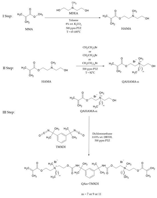 In the final step (Figure 1), a 50% solution of QAHAMA-n 0.070 mol (QAHAMA-8 26.67 g, QAHAMA-10 28.60 g, and QAHAMA-12 30.55 g), a catalyst, DBTDL 0.035 wt.% (0.013 g), and a solvent, dichloromethane 21 cm3, were introduced into a 250 mL, three-necked, round-bottom flask equipped with a dropping funnel, reflux condenser, and thermometer. A 50% solution of TMXDI 0.035 mol (8.55 g) in 6.5 cm3 dichloromethane was dropped into the flask. After the reaction mixture was brought to a boil (approximately 42 °C), a TMXDI solution was added to the flask dropwise for 1.5 h. The reaction was carried out for 5 h, maintaining the temperature in the flask. The solvent was removed using a rotary evaporator under reduced pressure (30 and then 3 mbar) and the products were stored in the laboratory dryer (SLW 53 STD, POL-EKO, Wodzisław Śląski, Poland) at 40 °C for 24 h. The products were light yellow, viscous, liquid resins. The reaction yield for all products was 100%.