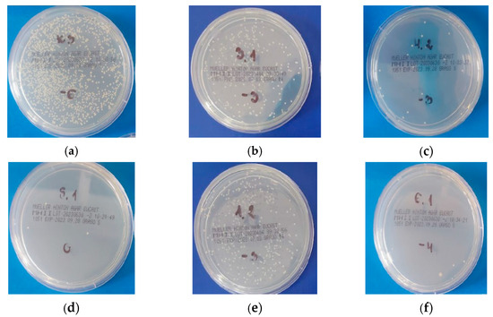 S. aureus colonies on Petri dishes after the adhesion test: (a) sterile water; (b) 40(UDMA); (c) 20(QA8+TMXDI); (d) 40(QA8+TMXDI); (e) 20(QA10+TMXDI); (f) 40(QA10+TMXDI).