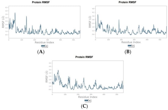RMSF graphs of the hit compounds during MD simulation. (A) Canniprene–COX-2 complex, (B) oroxylin A–COX-2 complex, (C) luteolin–COX-2 complex.