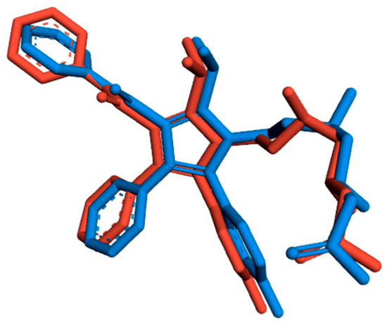 Superimposed 3D structures of the co-crystallized (blue) and docked (red) orientations of atorvastatin.