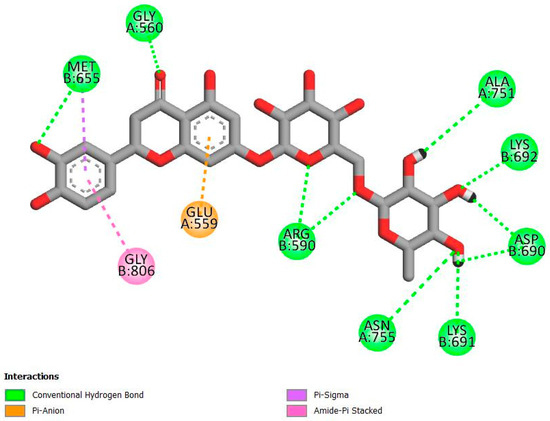 The binding affinity measures the strength of interaction between a ligand and a target protein or enzyme [12]. More negative values indicate stronger binding affinities and greater stability [13,14]. In Table 1, the more negative binding affinities of the flavanones eriocitrin, narirutin, brutieridin, and neohesperidin, as well as the flavones scolymoside, neodiosmin, rhoifolin, and naringin, compared to atorvastatin—a known HMG-CoA reductase (HMGR) inhibitor—suggest that these bergamot phytochemicals may have greater potential for HMGR inhibition and could serve as more effective cholesterol-lowering agents than atorvastatin.