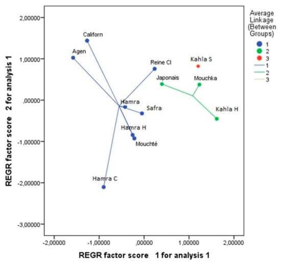 - Sidhoum, M.; Mahdad, M.Y.; Draoui, M.; Meghelli, I.; Bellatreche, A.; Gaouar, S.B.S. Genetic diversity analysis by the morphometric tool of some olive tree (Olea europaea) varieties in Western Algeria. Int. J. Biosci. 2018, 1, 14–25. [Google Scholar] [CrossRef]