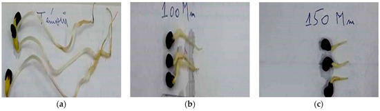 In fact, the radical length of the control seeds reached four times the radical length of the seeds treated at 100 mM and eight times the radical length of the seeds treated at 150 mM on the 6th day of sowing.