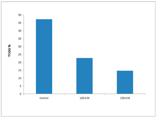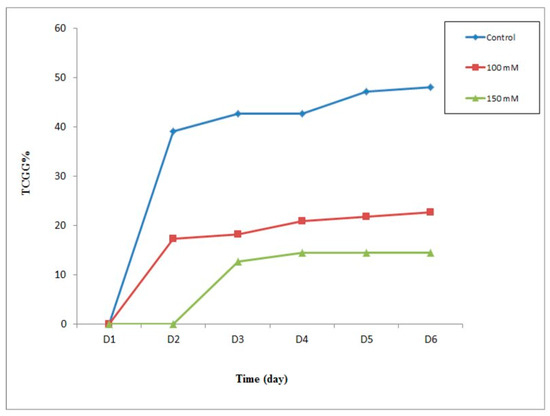 Furthermore, batches of seeds at 100 mM caused germination to progress slowly as compared to the control. In fact, the cumulative rate of germinated seeds increased from 17.27% to a maximum of 22.73% on the 6th day after sowing, a decrease of 25.45% as compared to the control.