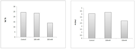 Figure 5 illustrate that the treatment with 100 mM NaCl caused a decrease in the germination speed (23.58%) and a slight prolongation over time as compared to the control. On the other hand, the treatment with 150 mM induced a remarkable decrease in the germination speed (13.96% against 24.39%) and the average time as compared to the control (2.9 days against 4.1 days).