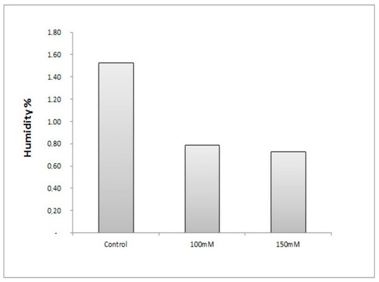 In fact, the humidity of the seeds treated at 100 mM reached half that of the controls, while the humidity levels of the batches of seeds treated at 150 mM were very low as compared to the control.