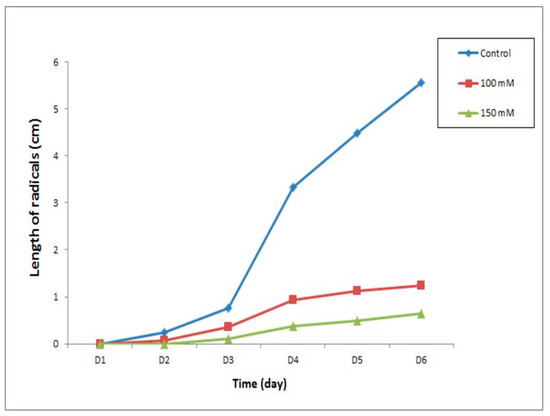 Similar observations are recorded in our conditions, in which the radical length of control seeds reaches four times the radical length of seeds treated at 100 mM and eight times the radical length of seeds treated at 150 mM.